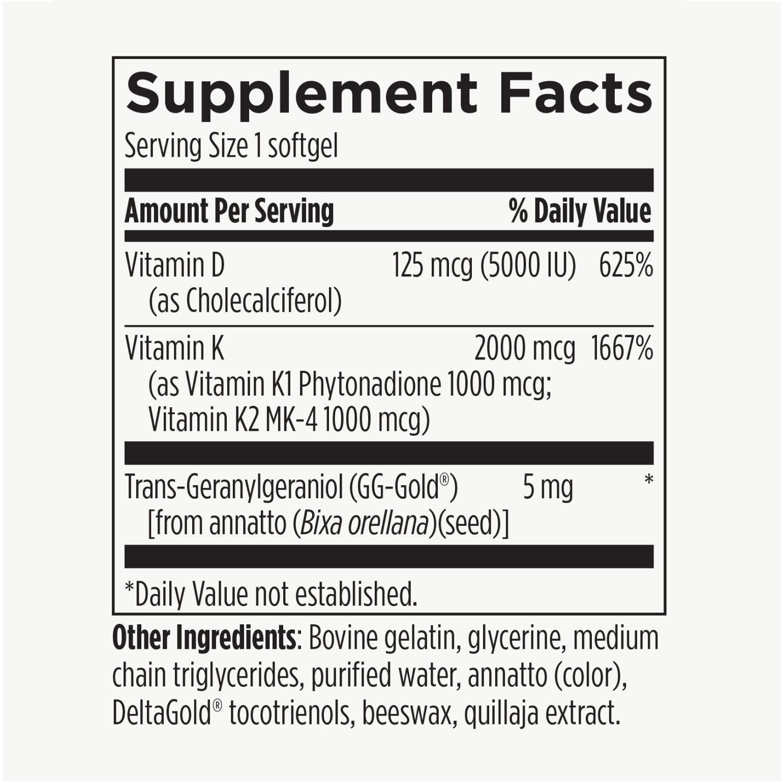 A potent blend of bioavailable D3 and K2 (MK-4 + MK-7) to support calcium metabolism, strong bones, cardiovascular wellness, and resilient gums.†